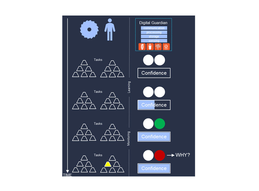 Digital Guardian est un dispositif autonome et intelligent qui observe des tâches très répétitives, effectuées par une machine ou par un opérateur. Au cours d'une première phase, Digital Guardian apprend activement le cycle habituel de la tâche. Lorsqu'il en a suffisamment appris, il peut passer à la phase de surveillance au cours de laquelle Digital Guardian peut détecter les anomalies et fournit les informations sur le capteur et le signal qui a déclenché l'alarme. Digital Guardian est en développement et nous sommes ouverts au partenariat pour avoir nos premiers clients pour en exploiter les possibilités.