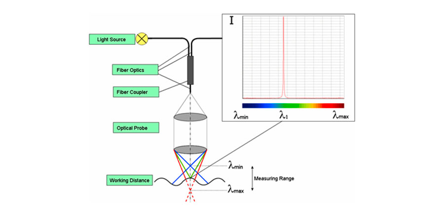 The confocal chromatic measurement principle is based on polychromatic light which is classified into different spectral colors by being focused by a multiple lens optical system at varying distances from the sensor. More than long wave red light (700 nm), short wave blue light (400 nm) is refracted. The start of the measuring range is with blue light, while the end is with red light. Each wavelength is in a different focal plane due to controlled chromatic aberration. Each wavelength is assigned with a specific distance to the target by factory calibration. In the case of a sensor system, this wavelength of light is used for the measurement which is precisely focused on the target. The light which is reflected is reproduced by an optical device on a light sensitive sensor element, on which the corresponding spectral color is detected and evaluated. Some of this light is reflected with each change of refractive index of different materials, making it possible to measure the thickness of transparent materials, even on one side. In multi-peak measurements, a number of distance points are evaluated.