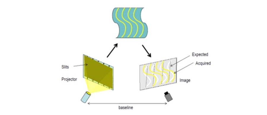 A structured light (known pattern) is projected onto the object. The light pattern will be distorted by the objects and the pattern observed by the camera will therefore be different from that initially projected. By determining the offset of each pixel in the pattern, it is possible to determine the depth of a given point in the camera's field of view. Interference between two lasers can also be used to create the pattern (laser interference method).