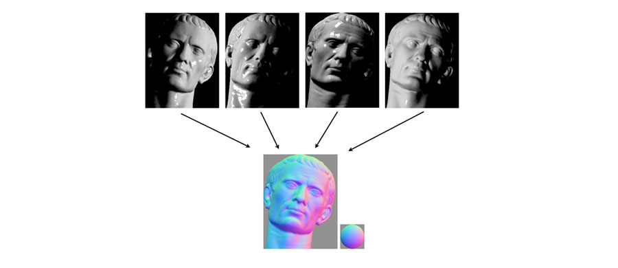 Also called "Photometric stereo", the technique consists of observing an object in different lighting conditions. It is based on the fact that the amount of light reflected from a surface depends on the orientation of the surface with respect to the light source and the observer. By measuring the amount of light reflected in a camera, the space of possible surface orientations is limited. When the object is illuminated with enough light sources from different angles, the orientation of the surface can be limited to one orientation.