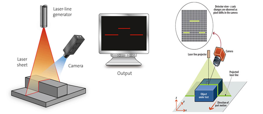 A laser line (or point) is projected onto an object and is observed by a camera at a certain known angle. The differences in height of the object along the laser line (z) correspond to the differences in height z 'seen on the sensor. Depending on z 'and the angle of the camera, the distances z can be calculated. A line or laser point sweeps across the object and a camera reconstructs the image.