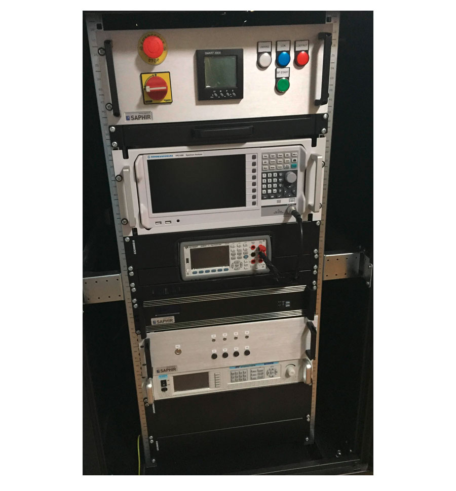 With a 100% qmt design, the test bench reproduces the hardware environment of a control motor card with an antenna, a motor and the connectors. The assembly is encapsulated in a Faraday cage in order to electromagnetically isolate the product under test from its environment.
