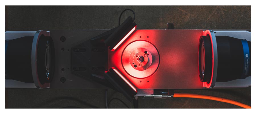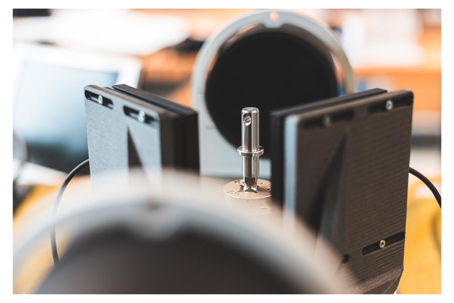 La mesure est réalisée sans contact par un système optique.L'équipement comprend une caméra très haute résolution avec son optique télécentrique (champ de vision 72x48mm) et plusieurs éclairages. La pièce est posée sur un outillage rotatif motorisé.