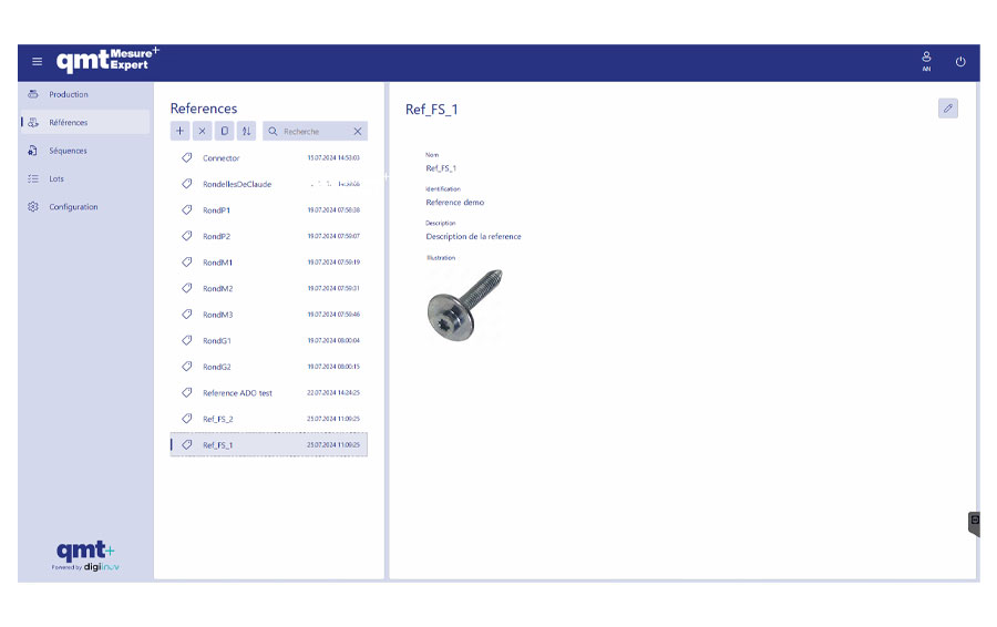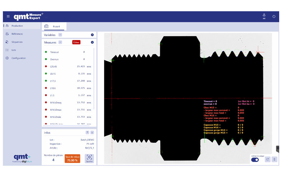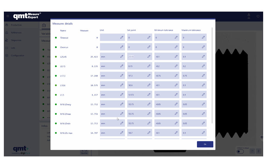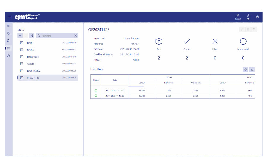 Après configuration du logiciel, le lancement de la mesure est réalisé par la définition d’un lot qui se référence à une famille de pièces et à une configuration spécifique.